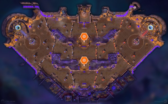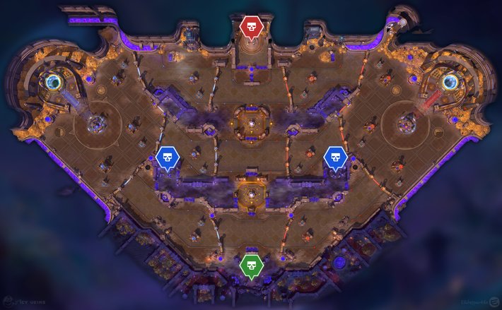 Tomb of the Spider Queen is a 3-lane Map belonging to the Nexus universe. The signature Objective of this Map are Webweavers. One per lane, they will fight alongside the team who pays the required amount of Gems, dealing heavy damage to enemy Structures on their way.