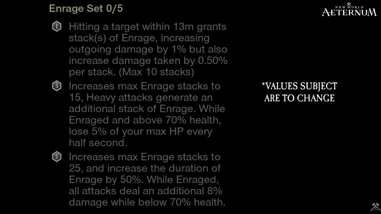 The image below highlights a preview of what AGS has in mind in regards to set bonuses. In this example, the “Enrage” set has a total of 5 unique pieces. You gain a specific bonus if you have one peice of this set equipped. This bonus gets stronger once you have three pieces equipped, and then reaches it’s maximum power when you have 5 pieces equipped.