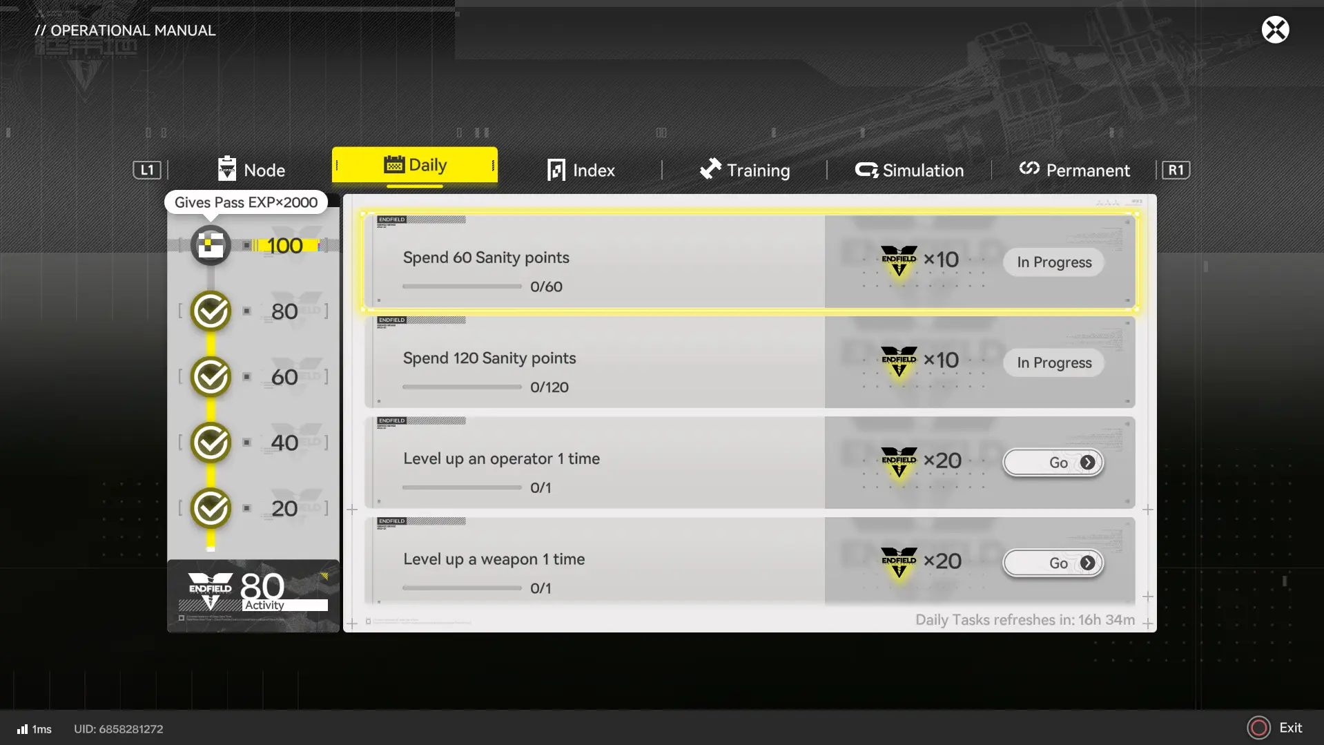 Even though sanity spending is not part of the fastest daily points route, you still want to spend it every day. Letting it cap means you are wasting regeneration and falling behind on materials.