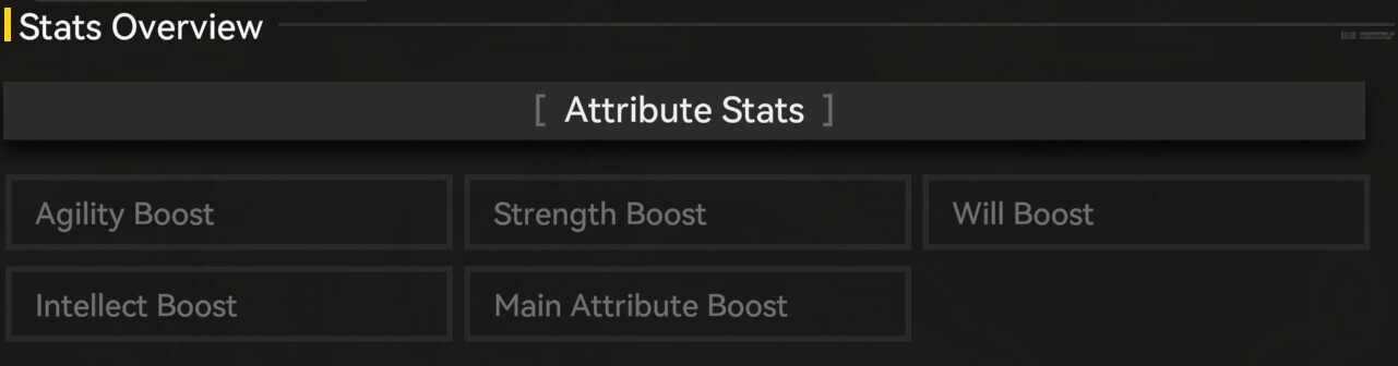 - Primary: Agility, Strength, Will, Intellect, and Main Attribute.