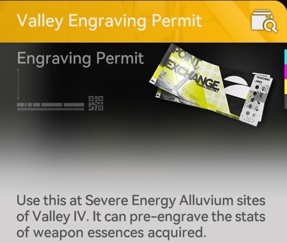 However, there is a system in place to help make the farm a bit more deterministic: The Engraving System. Engraving requires a specific item called a Valley Engraving Permit, which is only available from the Stock Redistribution terminal by purchasing them with Wuling Stock Bill for Alluviums in Wuling, or Valley Stock Bill for Valley IV Alluviums.
