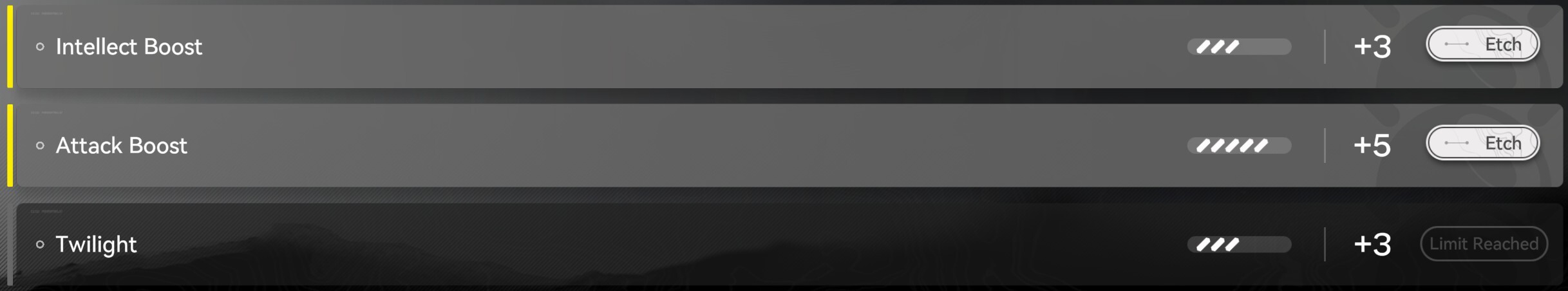 The maximum stat-boost available from Etching is a +6 on your Primary and Secondary stat, and +4 on the Skill (Third) stat. While you can reach the maximum +9 stat-level on the Primary and Secondary stat by leveling your weapon and etching Essences, higher levels of the Skill-stat are only achievable through raising the Potential of the weapon with duplicates, once you've capped out your Essence at +4.