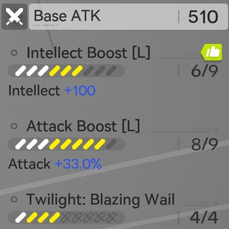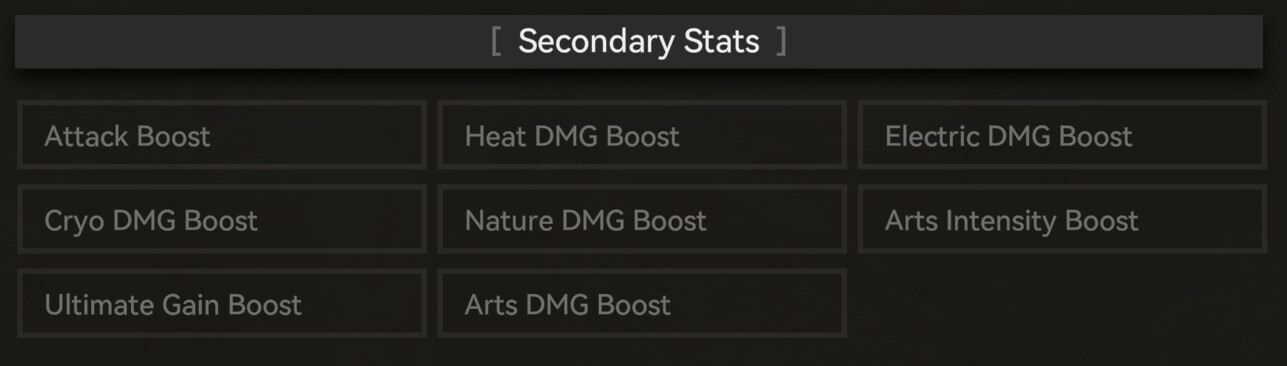 - Secondary:Attack %, Heat DMG, Electric DMG, Cryo DMG, Nature DMG, Arts Intensity, Ultimate Gain Efficiency, Arts DMG, HP Boost, Treatment Efficiency, Physical DMG, and Critical Rate.