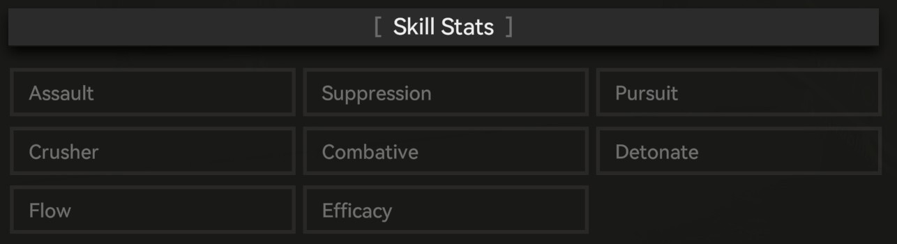 - Skill: Suppression, Detonate, Infliction, Pursuit, Crusher, Twilight, Combative, Brutality, Medicant, Fracture, Inspiring, Assault, Flow, and Impetus.