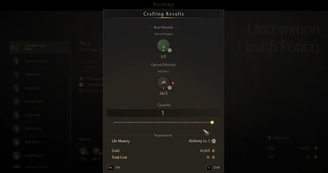 By visiting a primary town (such as the Dawn Slope Settlement), players will be able to visit the Alchemy shop, allowing them to interact with the Alchemy table to view the required ingredients for each consumable and start crafting. When interacting with the Alchemy table, players will be able to see the full list of craftable potions, required ingredients, gold cost, and of coure have the action to start crafting them.