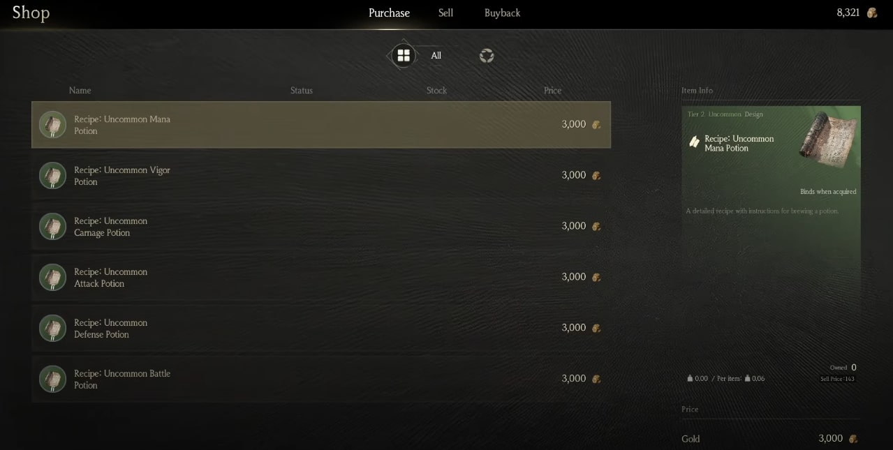 Some consumables require players to learn their recipe before they're craftable. Recipes can be found either by purchasing them directly from vendors, receiving them as quest rewards, or discovering them as you explore Setera (through mob drops or opening chests). When just starting your Alchemy journey, it's recommended to visit the NPC named "Frontline Physician Lyndel" in the Dawn Slope Settlement, who will sell you handful of entry-level Alchemy recipes for 3,000 gold each (pictured below).