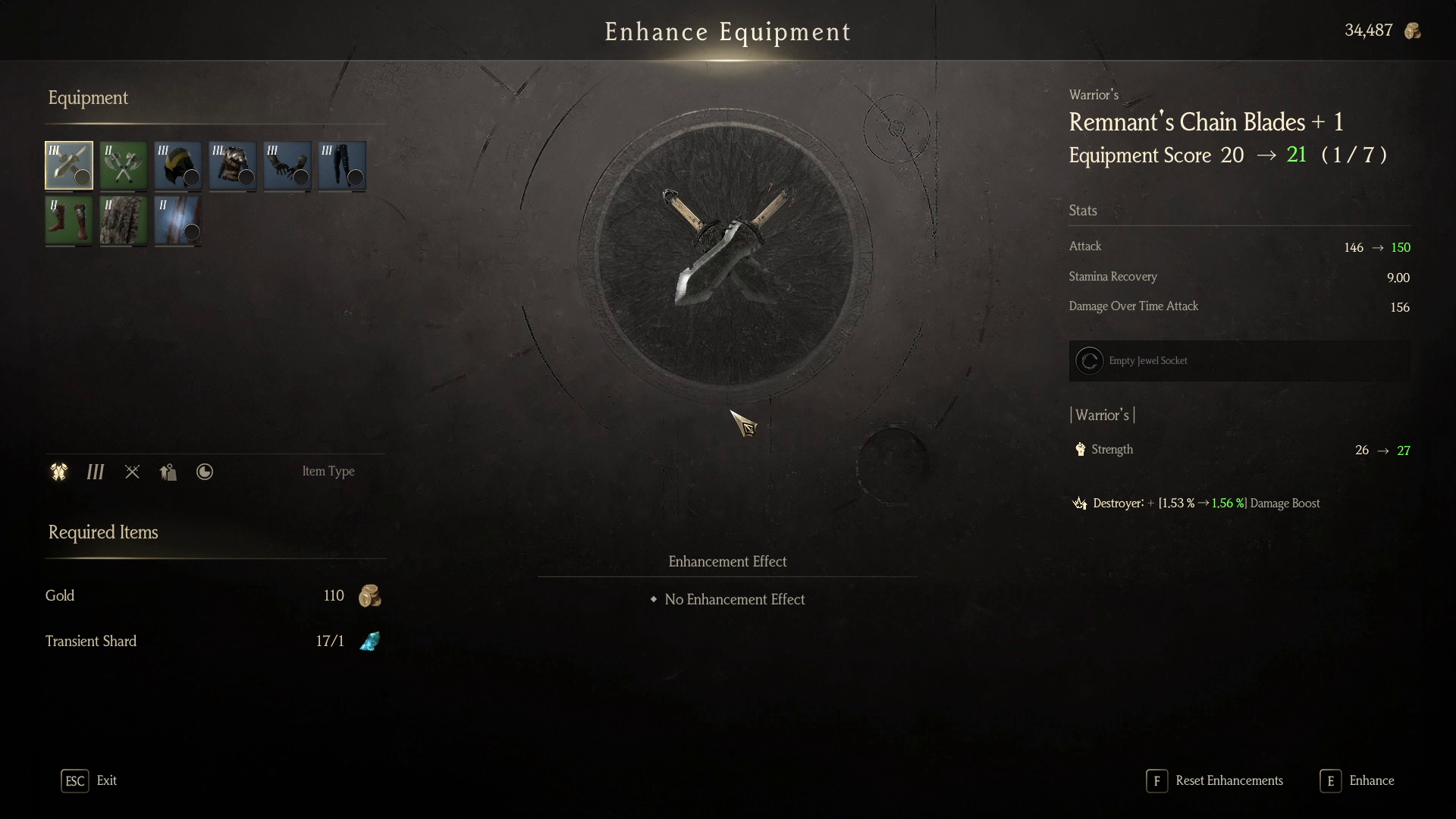 Enhancing is the main method of improving and upgrading your armor. By visiting the Enhancement NPC found in the main town, you enhance your equipment to boost both it's base stats and equipment score. Each successful enhancement increases the armor level by 1. (for example, +1 to +7), granting higher attack, defense, and other important attributes. Enhancements require Enhancement Shards and a decent amount of gold. Shards come in several colors that match the item rarity: green for uncommon gear, blue for rare, and purple for epic or higher tiers.