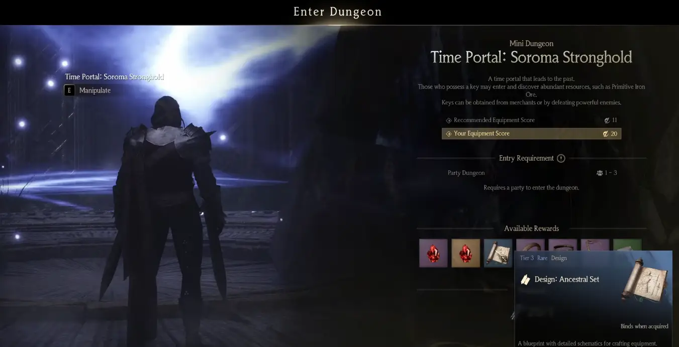 In order to enter these Time Portals, your character will need to have a Defector's Key, which is dropped from Elite Mobs in the open world. Each Time Portal has a recommended Equipment Score, and will provide a handful of unique rewards, including Armor Jewels, rare equipment designs, rare jewelry, and even some Primitive Iron Ore.