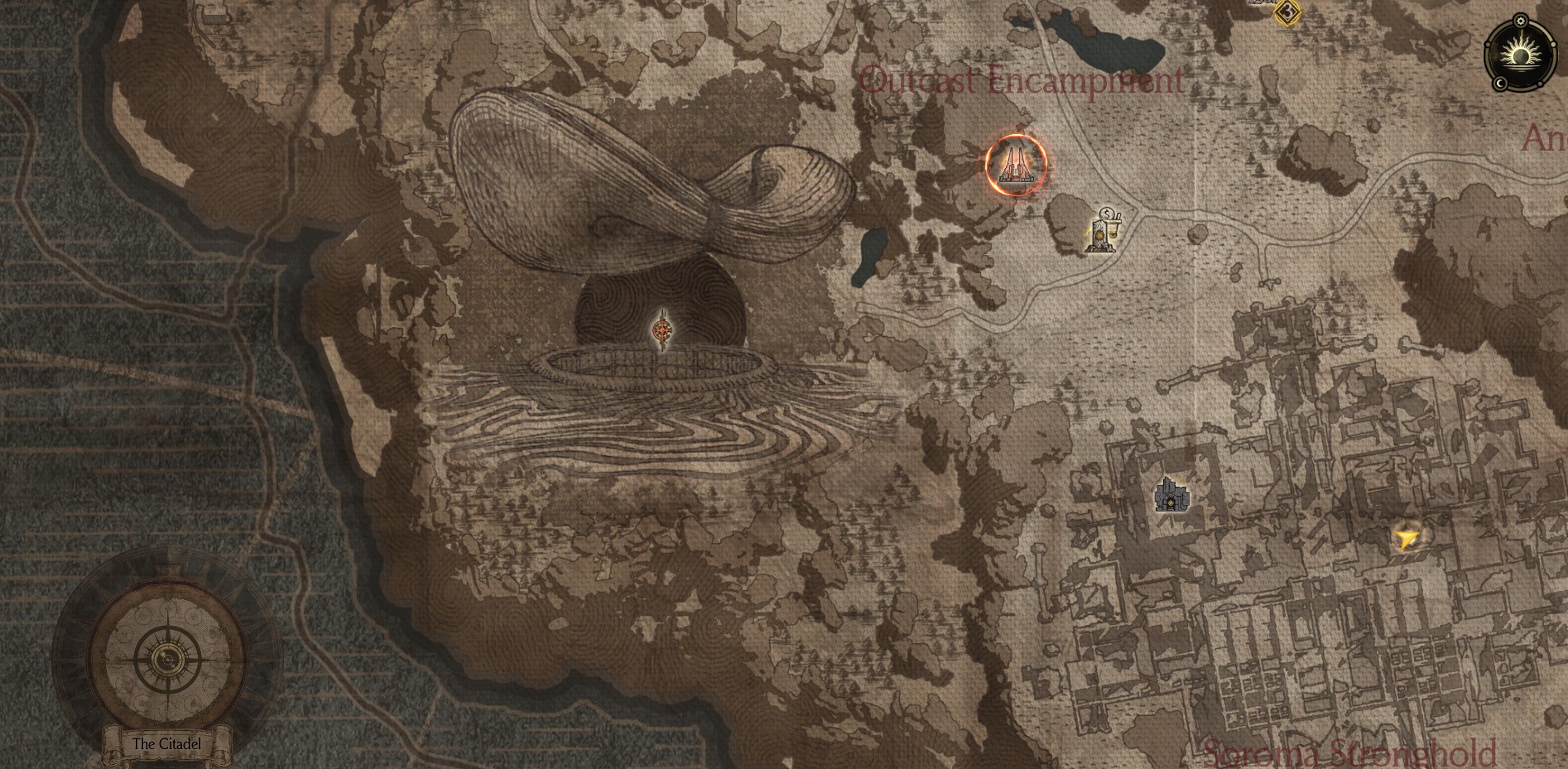The second Chrono Gate is located in the southwestern portion of the map, and is indicated by a large, dark hole (just southwest of the Outcast Encampment). When you approach this area, you'll see a massive hole in the ground, where you'll eventually need to jump down into in order to be teleported to the second Chrono Gate. The icon on the left side of the image below indicated the exact location of this hole.
