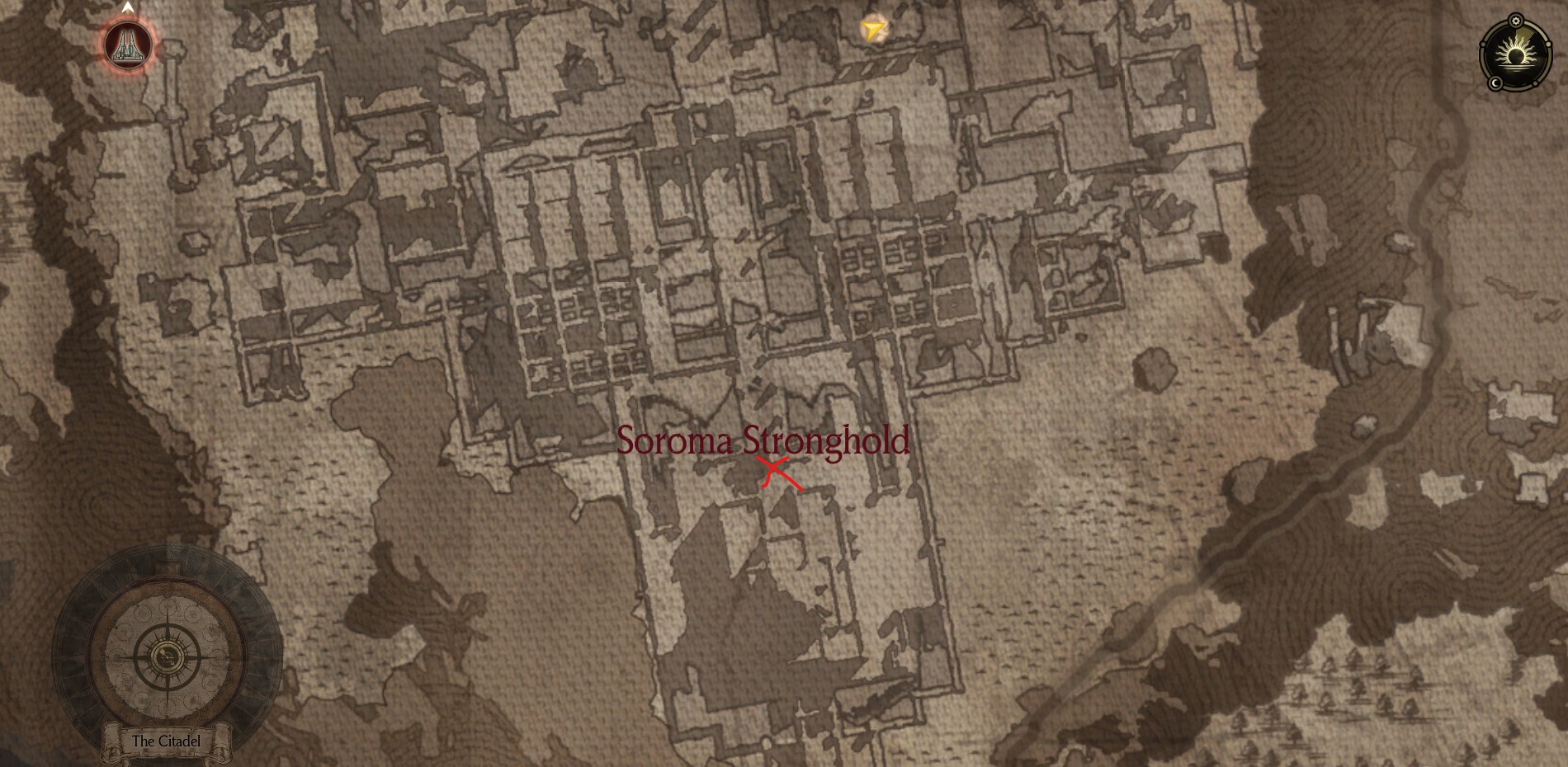 The third Chrono Gate is located directly within the Soroma Stronghold, located at the red "X" in the image below. Once you get to this location on the map, you'll see a lever off to the side in a large, empty room. Once you activate the lever, a staircase will slowly appear from the ground, allowing you to follow the steps and challenge the third Chrono Gate boss - Primeval Capra!