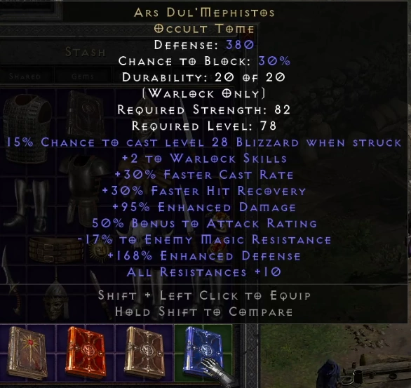 Diablo 2 is adding over 30 new items to the game including new Sets, Uniques, Runewords, and even a new item type, "Book" that acts as a Warlock shield. A couple of example unique books added include the following.