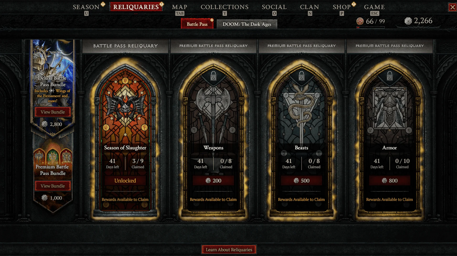 If you purchase the Deluxe Battle Pass Bundle (2,800 Platinum), you also unlock all three Premium Reliquaries and receive extra cosmetics included in the pack.
