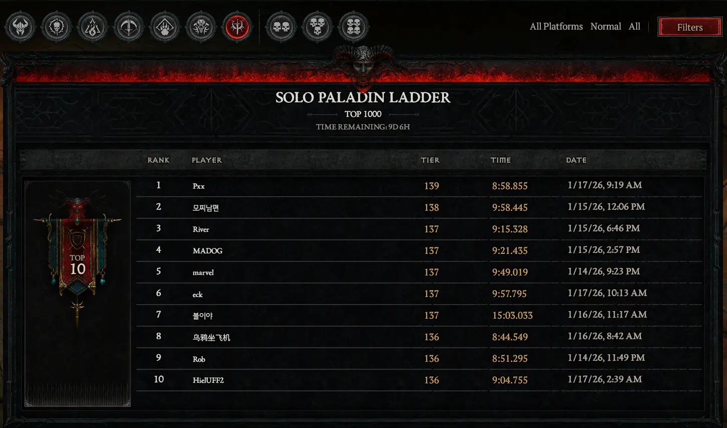That alone puts Paladin roughly 10 to 20 tiers above every other class, and it is not just a single player. Even Paladin players at the lower end of the top 10 are clearing tiers that other classes simply are not reaching yet.