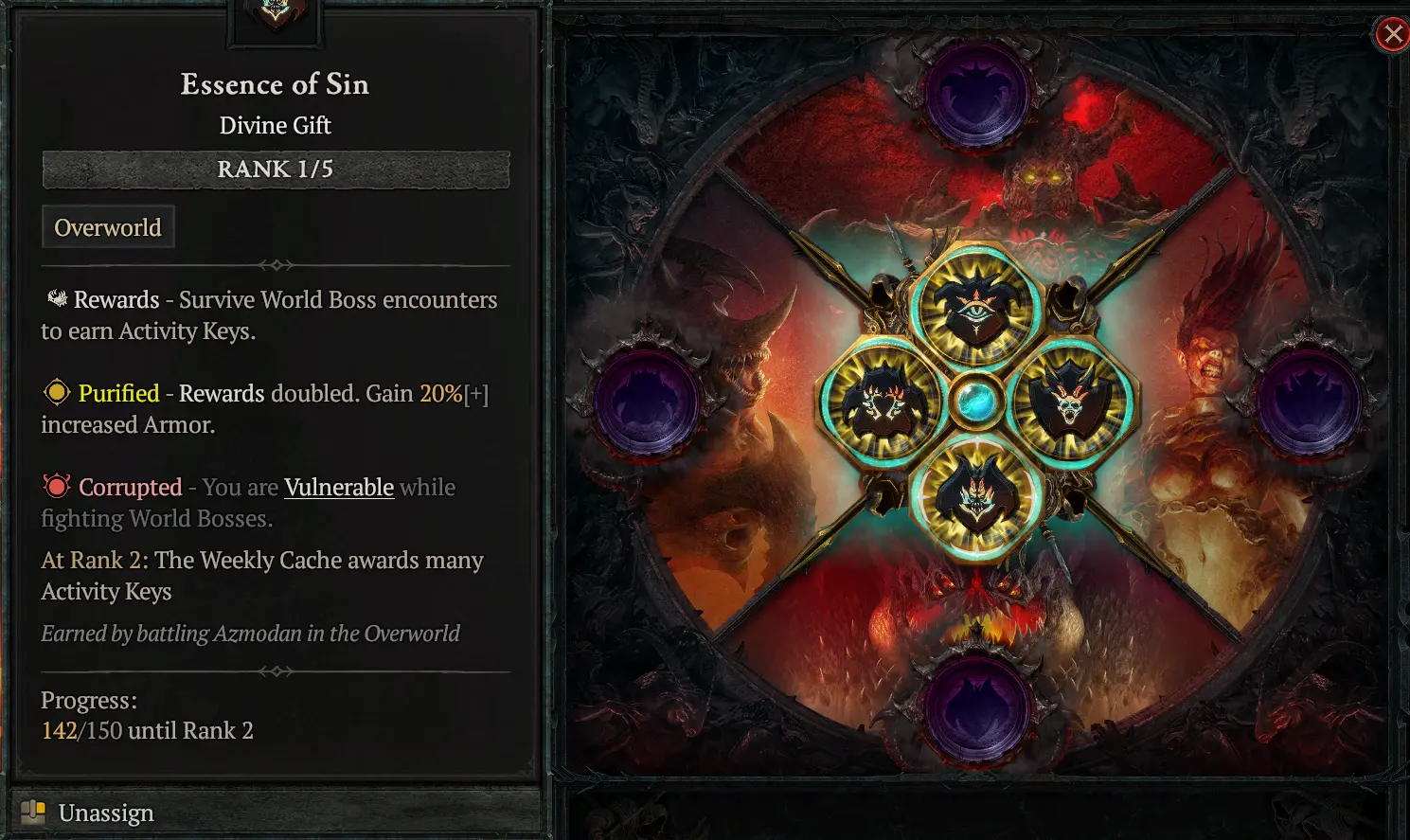 Farming Azmodan as a World Boss or summoning him near Zarbinzet (Hawezar) is also great during the event, due to how quickly you can level up the Essence of Sin Divine Gift for the purified effect (ideally to Rank 4 or 5) and drop more Nightmare Sigils. Normal difficulty kills are usually the fastest.