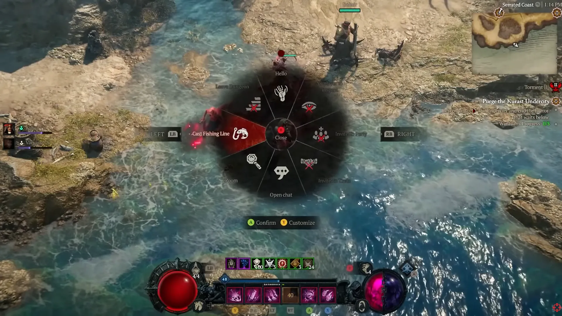 Probably the most unexpected part is the first look at fishing. You can cast a line directly from the emote wheel when near water, triggering a small minigame where timing seems to matter. Once successful, the fish just drops next to your character.