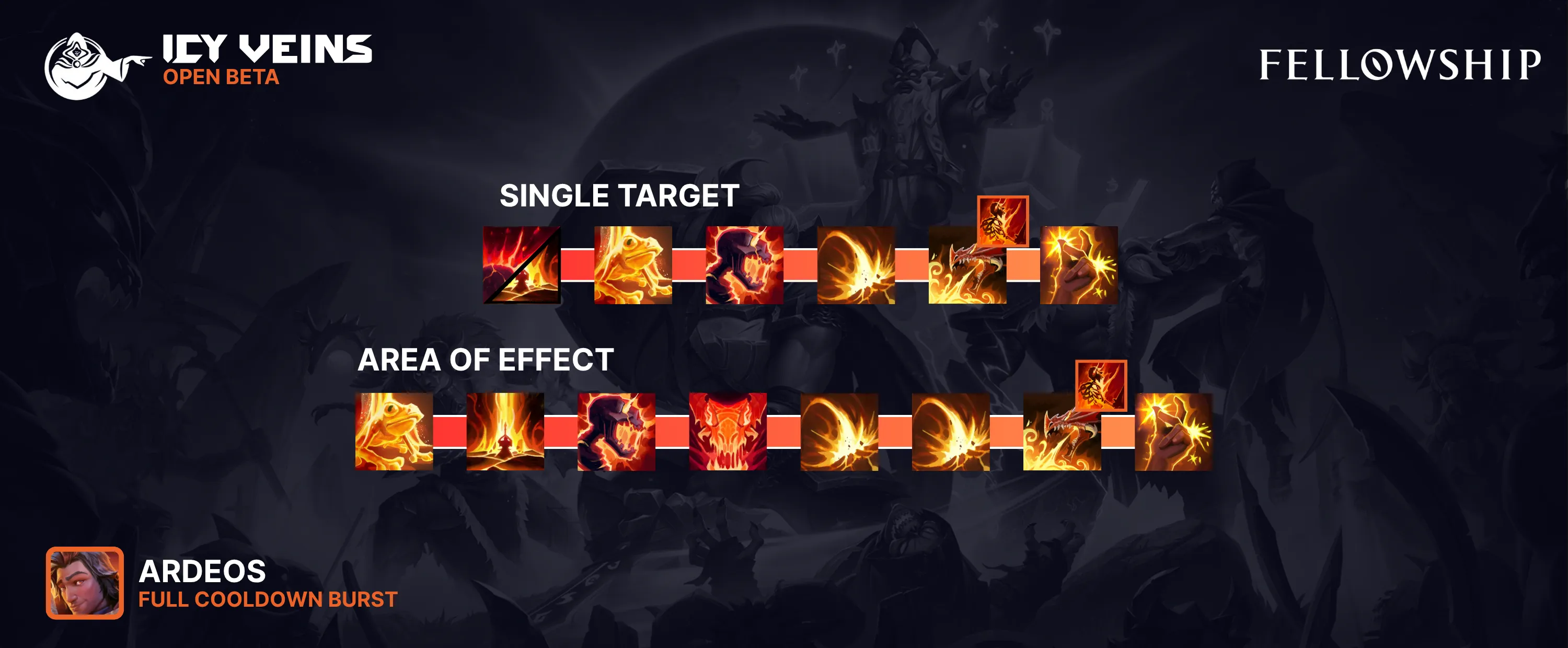 Your top priority playing Ardeos is stacking multiple DoT effects on targets as often as possible. For single target maintain Searing Blaze at 100% uptime, Fire Ball and Engulfing Flames together and every 45 seconds we want to combine Searing Blaze, Fire Ball and Fire Frogs then press Wildfire for a big Detonate damage window. This is due to our Detonate doing damage based on each of our DoT effects on a target so whenever we use Detonate we want it to be with as many stacked DoT effects as possible. For single target we press Detonate during our Wildfire windows, whenwe need some burst damage or whenever you might cap on Burning Embers.