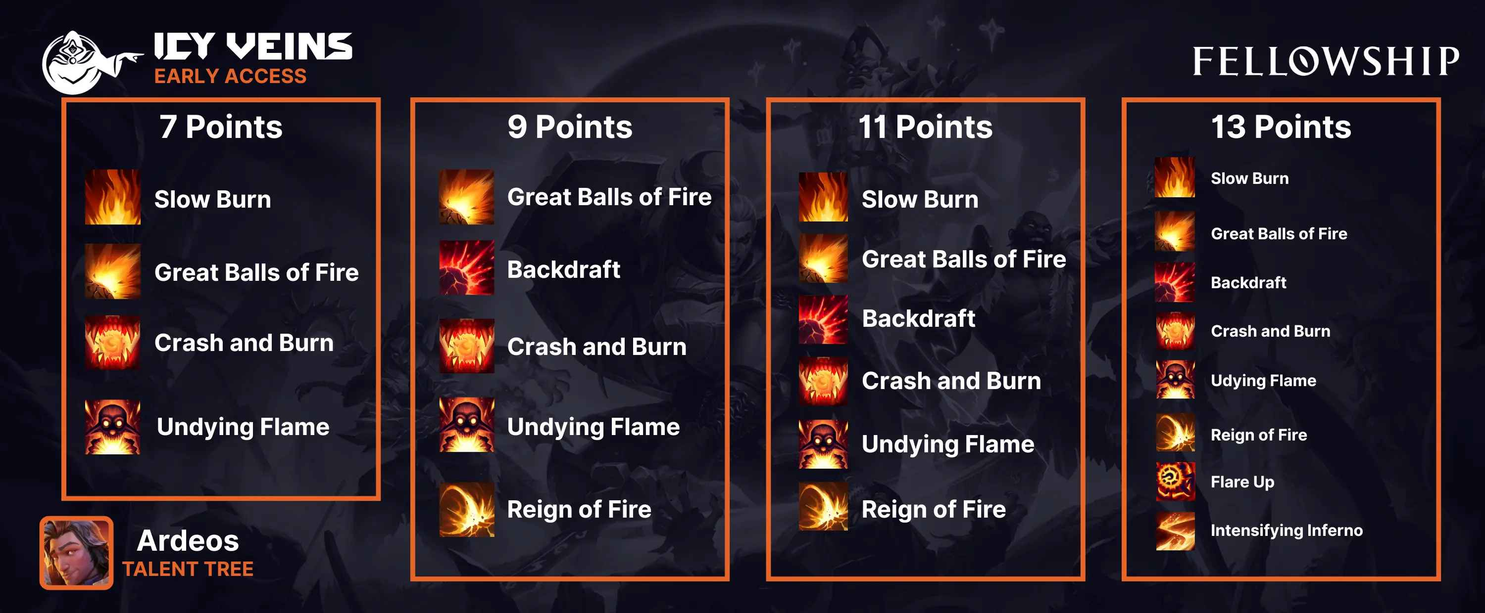 Firestarter (3B) increases the critical strike chance of all of Ardeos’ damage over time effects by 20%. Importantly, this also allows your Fire Frogs and the DoT from Fire Ball to critically strike, something they are unable to do without this talent.