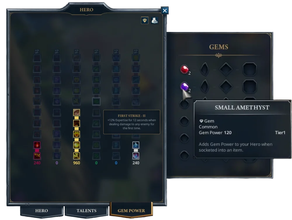 At Adept difficulty and higher, gems can drop and items can randomly drop with gem sockets. Gems have gem power, which unlocks passive bonuses for your character that progressively get more powerful as you reach further in each type.