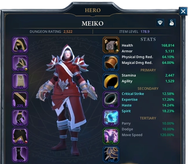 • Item Level: Every two levels of difficulty increases the base item level of the drop. Item level can be increased through gold and materials earned by dungeons and salvaging gear up to a cap based on the Item Rarity. Item level decreases if you go too far into over-time during a dungeon, down to the lowest of the respective rarity.