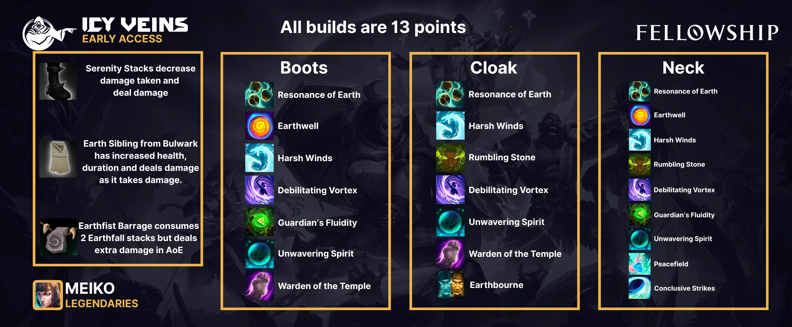 Below is the build we recommend for Meiko that focuses on manually sustaining your buffs for a net benefit through Warden of the Temple, and sustaining your Stone Shields through Serenity and Spirit.