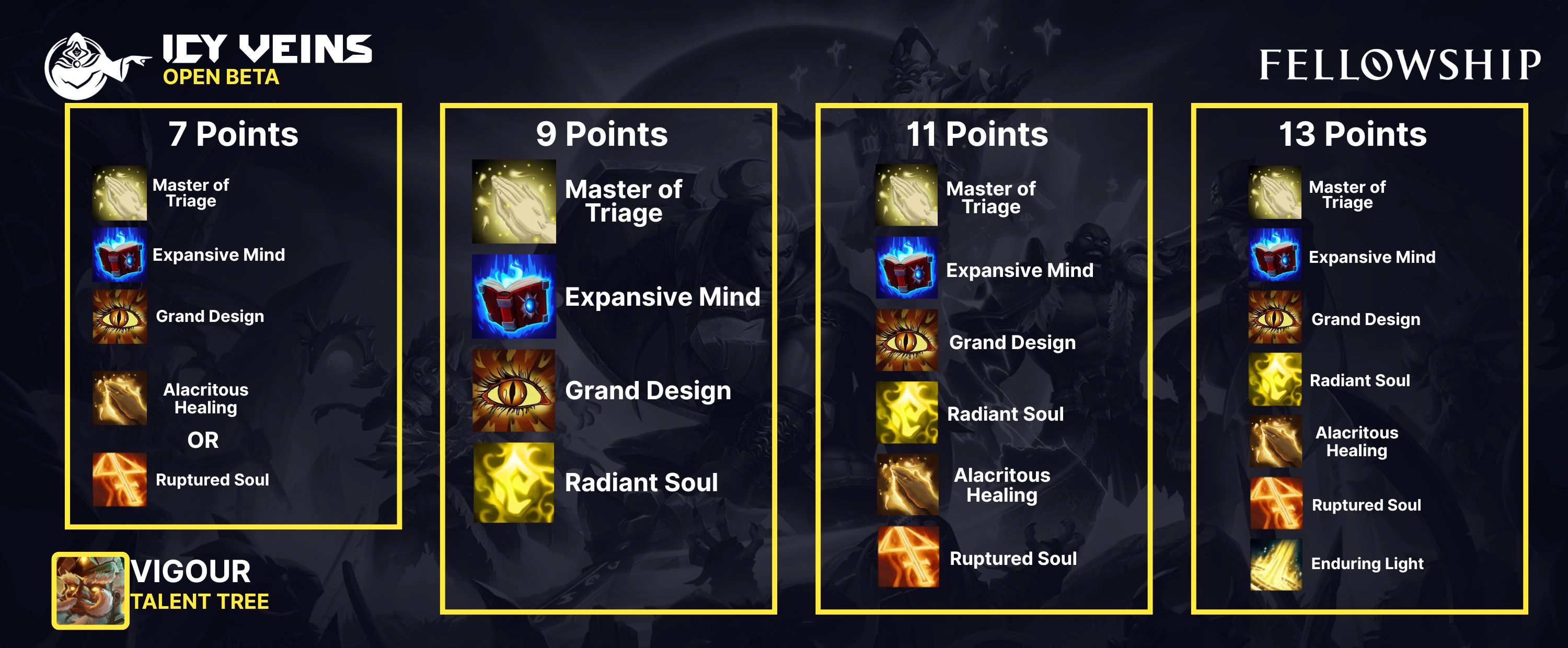 - Expertise – Increases all damage, healing and absorption effects triggered by Vigour.