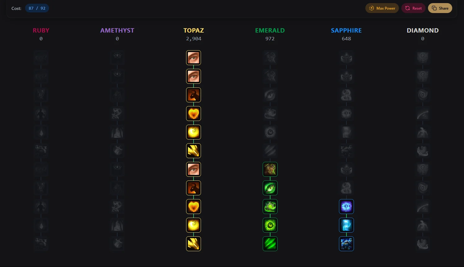 Aim as far as you can into the Topaz track as Xavian gets so much strength out of Haste. Blessings of the Commander – I will give some extra Cooldown Reduction on all of his abilities without going overboard in Emerald, and Resonating Soul will help survivability across the board, particularly when stacked with Shifting Spectrum, giving Xavian more time to heal himself up.