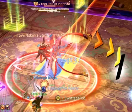 The boss will again telegraph Fireflight the same as she did in the beginning, only this time, there are fake telegraphs as well. Keep an eye on which path the boss actually takes, as only this determines where the cleaves will be. She will again end the mechanic with another Sun Circlet.