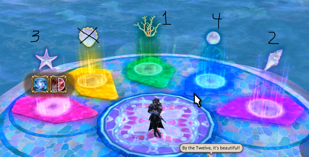 For this route, choose the Market at the beginning, then proceed through the dungeon until the party is prompted to choose the seaweed or the beach. Choose "The seaweed won't steer us wrong." and proceed until the party reaches the Tangled Seaweed Barrier. Do not interact with it. Instead, go to the round platform to the right of the barrier. Stand on the platform and perform /bow. This will make five colors light up. Next, in say chat, type "I am returned!" This will make five shapes appear. Stand on four of them in the following order: Coral, Conch, Starfish, Pearl. Doing so in the correct order will play a melody, and a secret pathway will open. Follow the path and confront the Deadly Dandan.