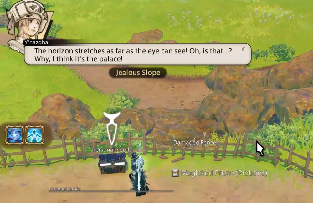 For this path, progress to where the Damaged Fence is from the previous two routes, but ignore it. Instead, follow the main path through the gate. Once you get to the Airy Wisp enemy, look for the crumbling white fence to the left of the large doors.