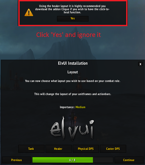 [6] Step 6 of 8: Layout: Choose the option you are interested in - a player / target / target of target Unit Frames will be at the bottom of the screen, not on the top and in a slightly different position for every role (You can click on every role to see the difference and to choose what you like better). If you chose a Healer role, you will get an announcement asking you to install the Clique addon, just click ‘Yes’ and ignore it, no need to install anything.