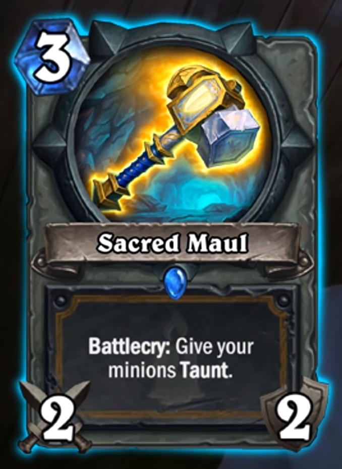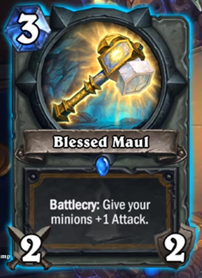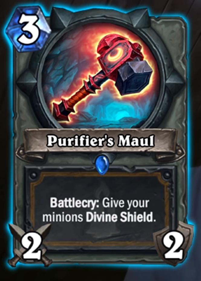 A Paladin Weapon, Unidentified Maul begins each game with an unknown effect and will become "identified" upon drawing the card from your deck. The weapon will always be a 3 mana 2/2, but will be randomly bestowed with one of the four following effects when drawn: