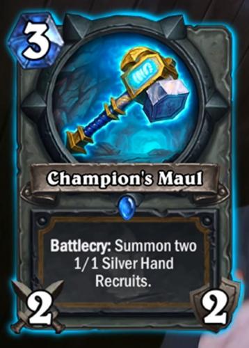 A couple of the potential modes on this card are very enticing. Two Silver Hand Recruits and a 2/2 weapon for 3 mana is a screaming deal, and the other three modes offer some serious value if you're already ahead on board. Given that three of the four potential modes on Unidentified Maul aren't very good when you're behind, I doubt this card will slot in as an instant replacement for Rallying Blade. Unidentified Maul could end up seeing play in token-based strategies, as granting +1 Attack or Divine Shield to a wide board of minions drawn from Small-Time Recruits is nothing to shake a hammer at.