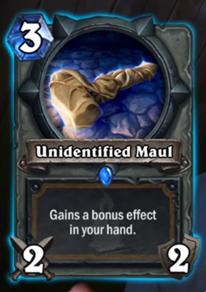 A Paladin Weapon, Unidentified Maul begins each game with an unknown effect and will become "identified" upon drawing the card from your deck. The weapon will always be a 3 mana 2/2, but will be randomly bestowed with one of the four following effects when drawn: