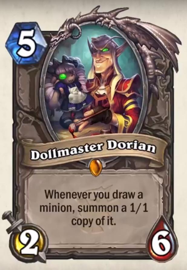 • Summoning 1/1 copies of a card is typically associated with combos or powerful Deathrattles and Battlecries, but since the copies are summoned on draw it forces some very unique deck building restrictions decisions. This positions Dollmaster Dorian as more of a value card than a "pure" combo card.