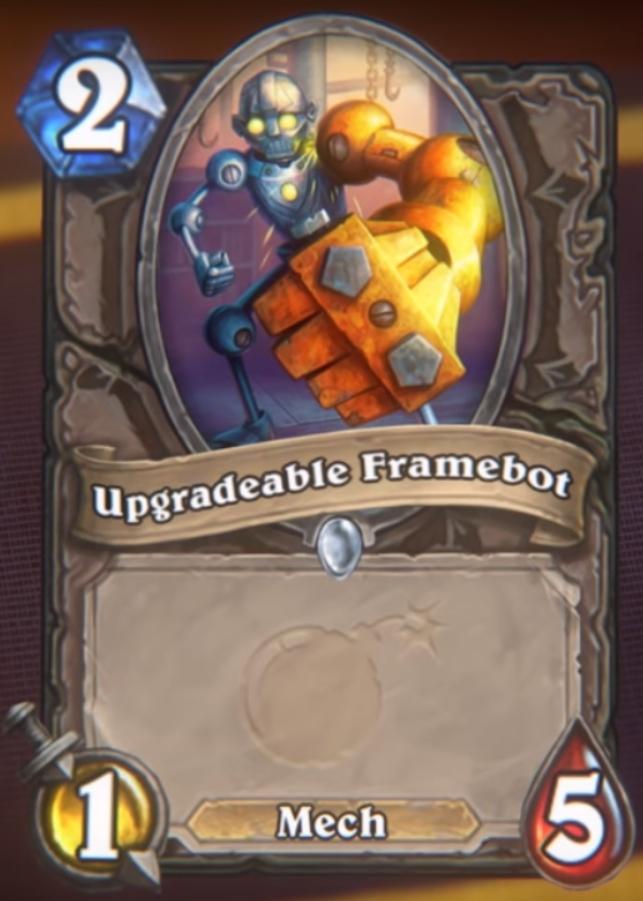 If you're looking for a good target for Wargear's massive stat boost, look no further than Upgradeable Framebot. 2 Mana for 6 total stats is an incredible deal, which should make Upgradeable Framebot a plug-and-play 2 drop in any Mech deck. The fact that this minion has a low Attack should not scare aggro decks away from it, as the 5 Health makes it incredible target for minion buffs.