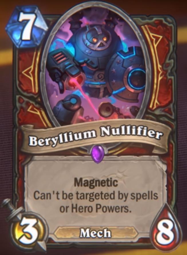 Our first Warrior card with Magnetic is Beryllium Nullifier, which doesn't excite me as much as the previous two cards. Adding 3/8 and "Can't be targeted by spells or Hero Powers" to any minion makes it nearly impossible for anything but a Vilespine Slayer or Voodoo Doll to kill, but 7 Mana is a huge ask for tempo decks. Magnetic appears to be an aggressive ability by nature, which makes me skeptical about the need for a 7 Mana card which only adds 3 attack the turn it comes down. Beryllium Nullifier seems better suited for a "Big Mech" deck, so we'll have to wait and see which other cards get spoiled before writing this one off.