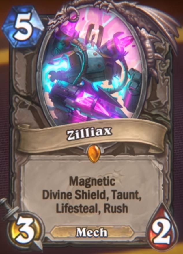 Last but not least is Zilliax, the walking keyword! This guy has a keyword for every point of Mana he costs, and a few of these keywords are highly desirable ones. Even if Zilliax didn't have Magnetic, he still might be a reasonable card for the fact that he can trade into any 3 Health minion with his Divine Shield and Rush while gaining you 3 life with his Lifesteal, then stick around on the board with his Taunt after he is done. Is this the card that Town Crier has been waiting for? The Lifesteal and Rush also make him a great target for Countess Ashmore in slower decks. I have a hard time imagining a world where Zilliax doesn't see quite a bit of play in the new meta!