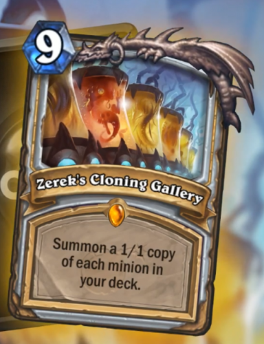 First of all, as a dedicated Vivid Velen OTK Priest player I could not possibly be more excited for this card. My first instinct with Zerek's Cloning Gallery is to summon a big, nasty board of combo minions such as Prophet VelenMalygos, and Radiant Elemental, then resummon all of them the following turn with a Diamond Spellstone. Of course, this card won't do much if you have already drawn all of your combo minions, but if you've already drawn all of your combo minions then you wouldn't really need this card in the first place! You can even dig for Zerek's Cloning Gallery with Shadow Visions to maximize the chances that you can summon every combo minion in the deck.