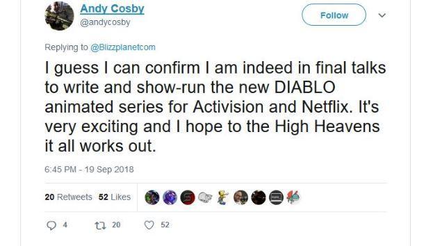 "I guess I can confirm I am indeed in final talks to write and show-run the new DIABLO animated series for Activision and Netflix. It's very exciting and I hope to the High Heavens it all works out."