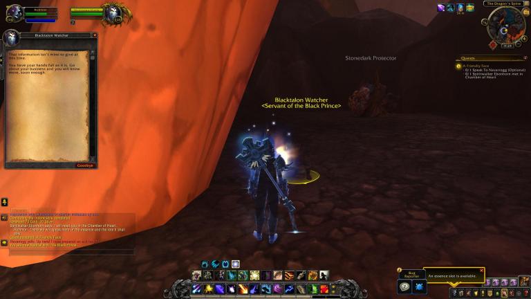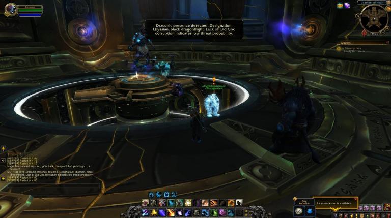 During the quest, we are aided by Spiritwalker Ebonhorn who is actually Ebyssian of the Black Dragonflight, but he poses no threat, according to MOTHER. What's interesting is the fact that Ebyssian can't leave Highmountain without risking Old God corruption, but we see him enter the new Chamber of Heart. (Source)