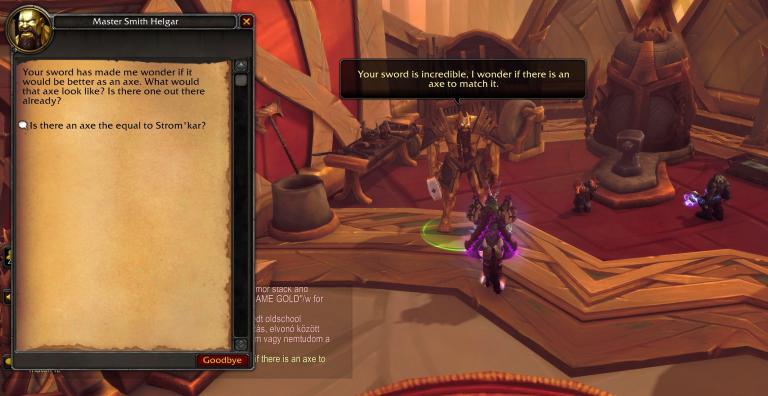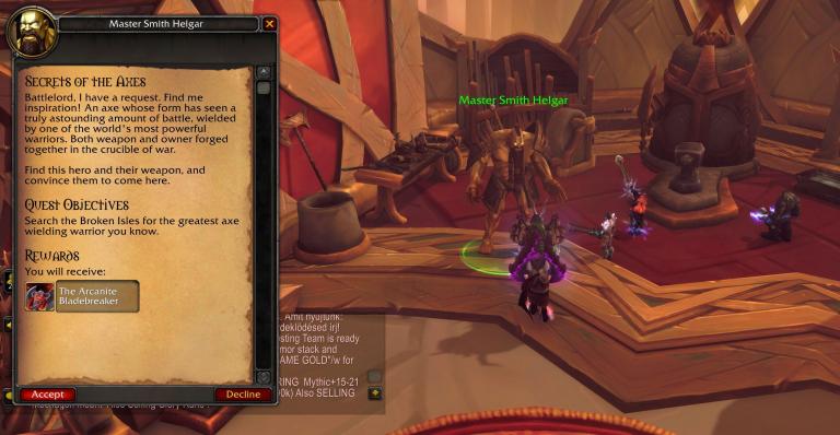 Strom'kar, the Warbreaker Strom'kar, the Warbreaker is about to get very Axe-y for a lot of Warriors in the US, as the hidden The Arcanite Bladebreaker Arcanite Bladebreaker  appearance is available today, so hurry! Head to your Legion Order Hall and grab the Secrets of the Axes quest from Master Smith Helgar (he's over by the Forge of Odyn) and he will give you a quest where you must duel Saurfang to earn the hidden appearance. Especially since Shadowlands brought the ability to transmog weapons in other specs to the artifacts, this is even more worth doing, and thanks to redditor Cyndus for noticing! The quest is usually up for around a day.