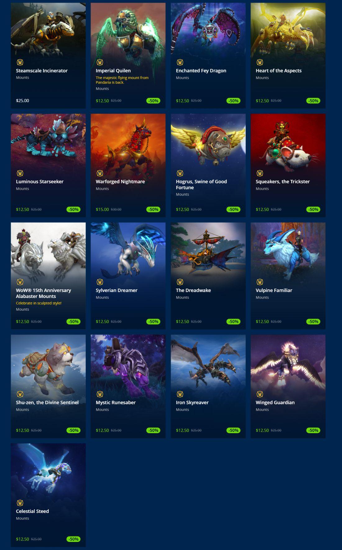 Squeakers, the Trickster | WoW 15th Anniversary Alabaster Mounts | Sylverian Dreamer | Vulpine Familiar | Imperial Quilen | Celestial Steed | Heart of the Aspects | Winged Guardian | Enchanted Fey Dragon | Iron Skyreaver | Luminous Starseeker | Mystic Runesaber | Shu-zen, the Divine Sentinel | Hogrus, Swine of Good Fortune | The Dreadwake | Warforged Nightmare