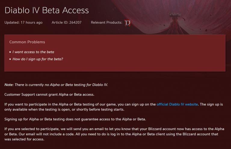 As spotted by BlizzPlanet, the technical support page for the Diablo 4 beta, which has existed since the official D4 page went up, was updated today. So what was changed? A very crucial and relevant part, as it turns out, the line "There have been no announcements regarding a Diablo IV beta at this time."