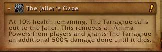 The Jailer's Gaze The Jailer's Gaze - At 10% health remaining, The Tarragrue calls out to the Jailer. This removes all Anima Powers from players and grants The Tarragrue an additional 500% damage done until it dies.