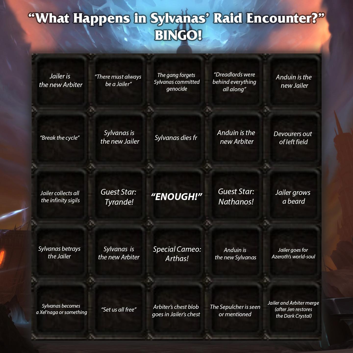 Tyrsenus transformed all the possible outcomes into a bingo card. In an interview, Blizzard promised us an epic battle against Sylvanas that will forever change the course of Shadowlands. What do you think will happen at the very end of the raid?
