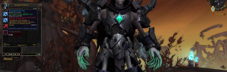 Packaged Soul Ash Packaged Soul Ash is a new item added in Patch 9.1 that lets you purchase a Bind-to-Account bag that you can use to send Soul Ash to your alts. It costs 1.500 Soul Ash and contains 1,300, meaning there's a 200 Soul Ash "fee" to be paid every time you want to transfer Soul Ash between your characters. On top of that, it is only purchasable from Torghast brokers, so you have to continuously run Torghast if you want to buy the bag.
