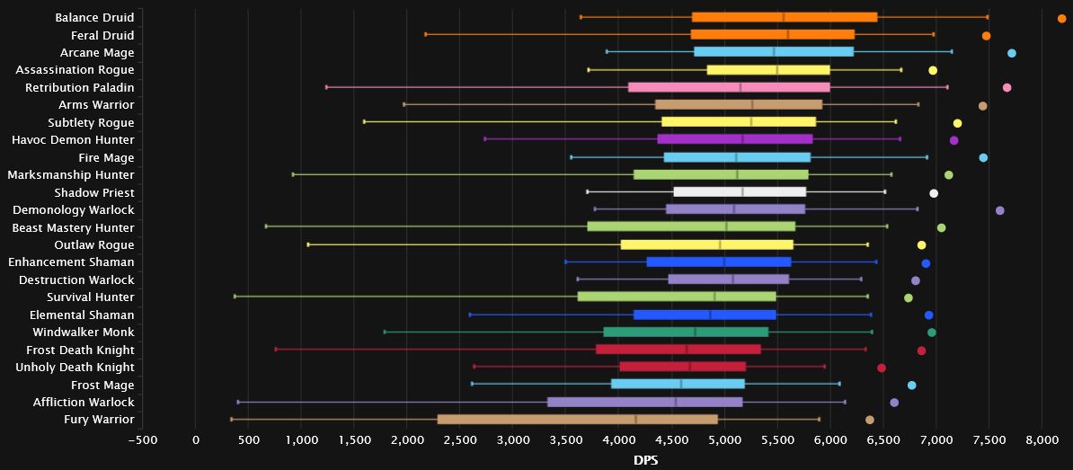 The big news here in the more generalist rankings is still Survival, as it's doing even better than in the top percentiles, moving into 5th place after being in solid shape last week as well, proving that wasn't just a fluke. When you see a Hunter spec appear in the top like that, you really just assume it's Marksmanship, but the melee Hunters have broken through - now let's just see if they're here to stay. The other big underdog story is Feral, as it rose a lot this week too, jumping 5 spots and into the top 10! The Monks take back their top spot from the usurper Fury, which actually falls quite a bit into 4th this week, even getting passed by Arms, which is back in 2nd place. Affliction seems to be here to stay, as it isn't budging from it's very persistent top spots, while Demonology drops even further in the generalist rankings, down 4 in 9th.