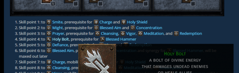 Vladoonet 0 Report post Posted October 3, 2021 On 9/29/2021 at 2:46 PM, Oxygen said: It's certainly not a fast build early on, but it can work from 18 and on, especially if you have some points in Blessed Aim to improve Blessed Hammer's damage, and perhaps a few skill bonuses (Tarnhelm or +Blesse Hammer on a Paladin weapon come to mind). I'm curious, why level 30 specifically? level 30 redemption becomes available, that helps a lot with Mana. From what i read in different guides, Blessed aim is the last one to level, focus should be on blessed hammer, concentration, vigor, THEN blessed aim. With the caveat of not investing too much at first in BH to not have the mana cost skyrocket. Quote Share this post Link to post Share on other sites