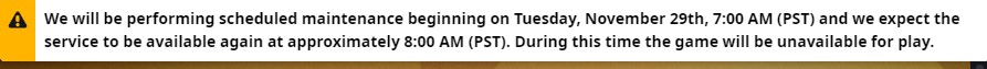 This week's scheduled maintenance will take just one hour. Servers will be taken down tomorrow at 7:00 AM PST in the US and on November 30 at 3:00 AM for EU players.