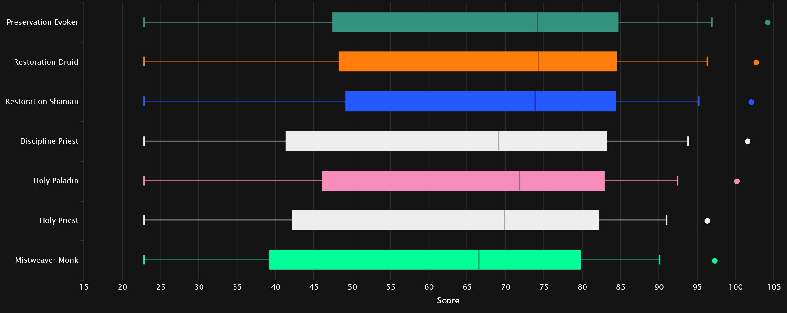 Nothing is moving Preservation out of the top it seems, with Resto Druid also very much stable in 2nd, but we do see Resto Shaman move up from its penultimate spot into 3rd. Holy Paladin moves in between the Priests and Mistweaver remains at the bottom.